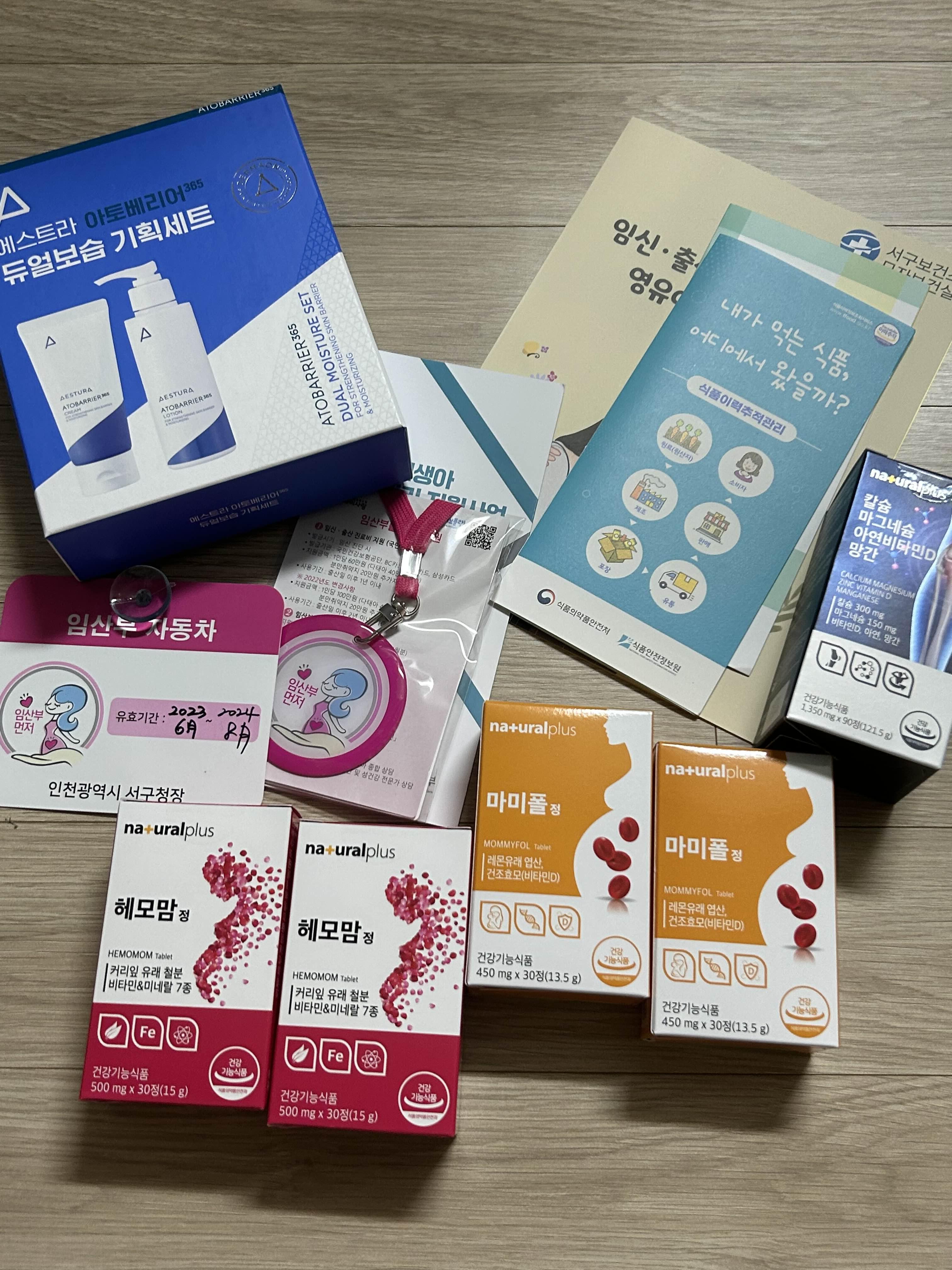 온라인, 오프라인 둘 다 신청 가능하고 거주 중인 관할 보건소에다가 임산부 등록을 하면 된다. 지역마다 구비 서류는 차이가 있기 때문에 미리 문의 후에 준비를 하면 될 것 같다. 나는 임신 등록을 온라인으로 신청을 했다. 지역마다 임산부 혜택이 다른데 처음 임신 등록을 하게 되면 임산부 배지 및 지원 물품을 받을 수가 있다. 내가 거주하는 지역은 인천 서구로 임신 기간 중 섭취해야 하는 영양제들과 임산부 배지 튼살 크림 등 임신 축하 지원 물품들을 받을 수 있었다.